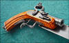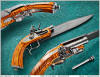 Laffite's Revenge Blade Show 2013 winner of: Best of the Rest Award This is the first combination weapon built by me. The completed piece was test fired on April 22, 2013. Except for the top jaw screw, all of the damascus parts are made of 1084 and 15N20 steel. The top jaw screw is 1084 and 1018 steel. The barrel is 3 1/2 inches long, in .50 caliber. It is a spiral welded barrel in the damascus pattern, two iron Crolle. The breech plug is also damascus steel, with ladder pattern in the tang. The flint-lock mechanism was designed and built by me. All of the exterior lock parts are made of damascus steel. The lock plate damascus pattern, matches the damascus pattern used in the knife blade. The only parts of this lock that are not damascus are the tumbler, sear, bridle, main spring, sear spring and internal screws. The 12 inch long blade is in the Woodhead pattern. In this style of blade, the spine slopes downward towards the point. This provides for the blade to be out of view when aiming the pistol, so that it is not a distraction. The blade's tang is sculptured to resemble the lock mortise on the opposite side of the pistol stock. The lower portion of the tang lies flush with the surface of the pistol grip. The blade damascus is w-pattern, that has been pressed with West Texas Wind dies. The pistol stock is made from fiddle-back maple. It is styled after French dueling and target pistol stocks of the late 1800s. The fluting on the grip is reminiscent of decorations commonly found on French pistols of this era. The damascus steel ramrod screws into the ladder pattern damascus butt cap and stores in the grip of the pistol stock. The trigger guard is in ladder pattern damascus. It was forged to shape and hand sculptured to its final form. The trigger and trigger plate are also damascus steel. Each of the screws used on the exterior of the piece have been engraved with a flower design. The overall length of this piece is 17 1/4 inches. The overall height is 6 3/8 inches, from the top of the cock to the bottom of the pistol grip. Below is a video of the first two shots fired from the finished piece. The load was 26 grains of FFF black powder. .490 round ball with a .015" patch. FFF powder was also used in the flash pan. Click on this link to go to my Damascus Barrel page, where there are pictures and a video of the making of the barrel used on Laffite's Revenge. Damascus Gun Barrels